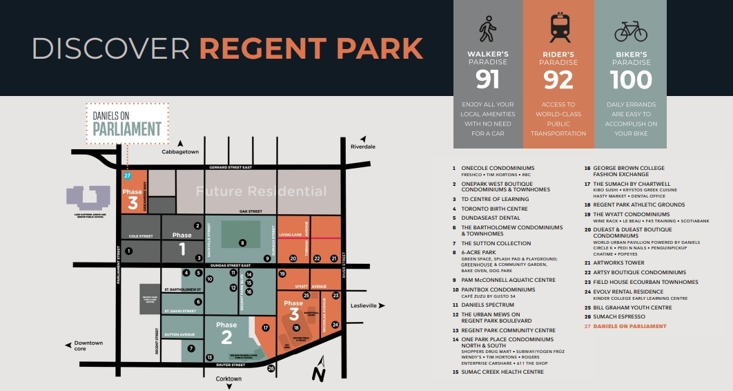 Rising up where Regent Park meets Cabbagetown, Daniels on Parliament provides the ultimate combination of downtown convenience and carefree condo living. Embrace the local culture & art scene. Enjoy great dining, shopping, cafés and schools all close by. And, with the TTC at your doorstep, explore the surrounding neighbourhoods, parks and everything Toronto has to offer.